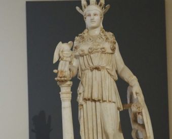 Athena occupies a central role in these scenes. Marble reliefs in the Archaic Gallery, originating from the earlier Temple of Athena Polias, show Athena in the act of spearing a Giant. The east metopes (rectangular sculpted panels) of the Parthenon continue this theme in a more formalized and monumental style. Here, Athena appears in full battle gear alongside other gods, engaged in a long and violent struggle that culminates in the defeat of the Giants. One of the most striking examples is Athena’s combat with a Giant, one of the few clearly identifiable mythic combat scenes in which her warrior role is unmistakable.